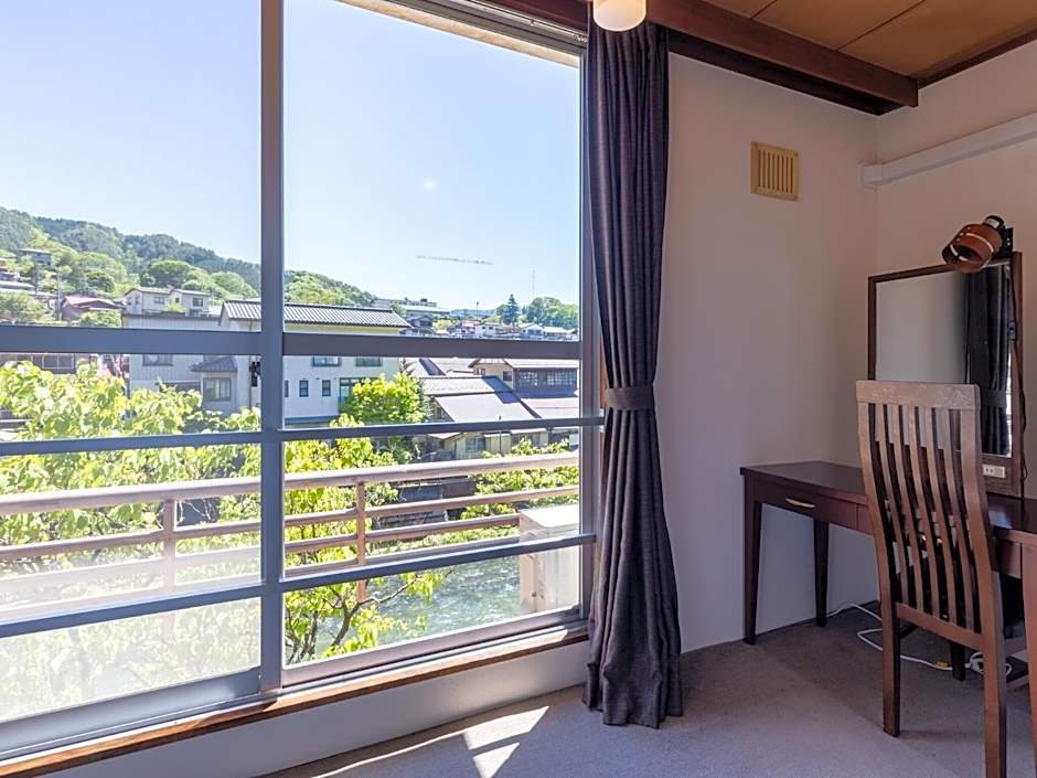 The twin room includes a private bathroom, well-fitted with a bath, a shower, a bidet, a hairdryer and slippers. The twin room features air conditioning, tatami, heating, a flat-screen TV, as well as river views. The unit has 2 beds and 1 futon.